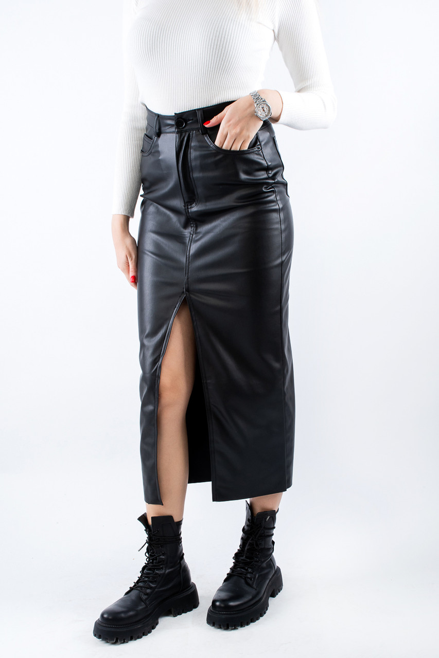 Спідниця міді з екошкіри з розрізом чорна 2931-W3 (2000000119281)